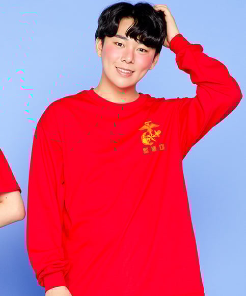 베이직 라운드 티셔츠 긴팔 레드 (왼가슴, 소매, 등해병대 인쇄)